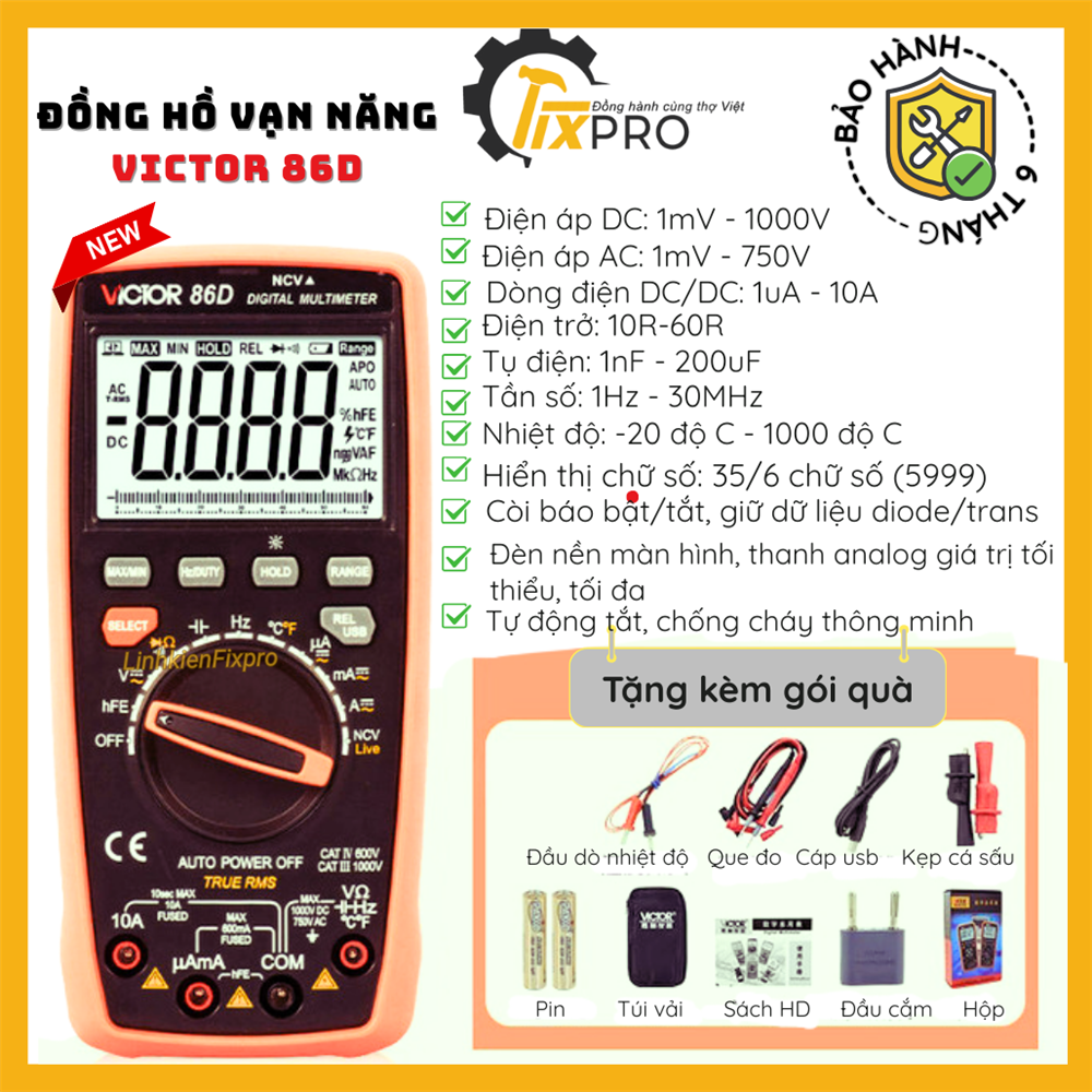 Victor 86D là một chiếc đồng hồ vạn năng đa năng, độ chính xác tương đối, nhiều tính năng tiện ích như kết nối máy tính, màn hình lớn và thiết kế bền. Đặc biệt với mẫu mới nhất đã trang bị thêm tính năng đo điện áp không tiếp xúc NCV và TrueRMs. Rất phù hợp với người dùng kỹ thuật, bảo trì, nghiên cứu, hoặc giáo dục.