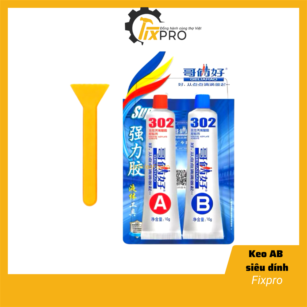 - Keo AB 302 siêu chắc, siêu dính, ứng dụng đa dạng như dán nhôm, sắt, gỗ, gạch, kim loại, nhựa, gỗ, men sứ, mica, thủy tinh,....