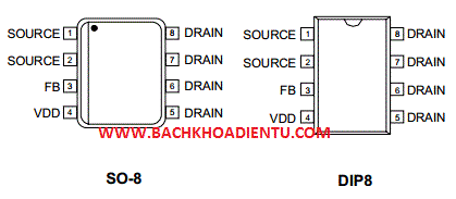 Chân 5, 6, 7, 8 ( chân DRAIN): Đây là các chân ở cùng một phía của IC nguồn này. Trong sơ đồ mạch nguồn thì 4 chân này được nối với nhau và được nối với một đầu cuộn dây sơ cấp biến áp xung. Các chân này kết hợp với chân 1 và chân 2 tạo thành một khóa điện tử tần số cao đóng cắt điện cho cuộn dây sơ cấp biến áp xung.
